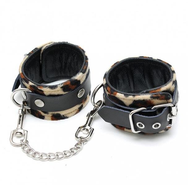 Esposas de cuero, con estampado de leopardo en el exterior. Las esposas tienen un ancho de 5,5cm y se pueden ajustar con hebillas en 6 posiciones. Están conectadas por una cadena de metal con ganchos de carabina en cada extremo.