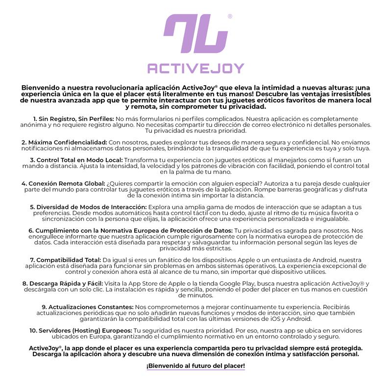 ActiveJoy®, la app donde el placer es una experiencia compartida pero tu privacidad siempre está protegida. Descarga la aplicación ahora y descubre una nueva dimensión de conexión íntima y satisfacción personal.
