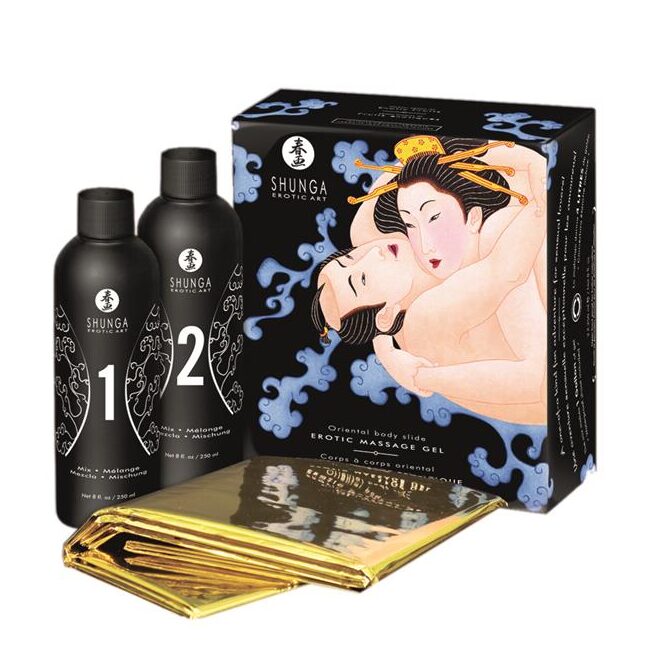 Con este kit de masaje oriental dar y recibir masajes nunca volverá a ser lo mismo. Este kit contiene una mezcla para preparar hasta 4 litros de gel de masaje y una sábana dorada para que os trasladéis a un mundo lleno de placer. Pon la sábana en la cama, en el sofá, o incluso en el suelo, realiza la mezcla y preparaos para el masaje más placentero y suave de vuestras vidas.
